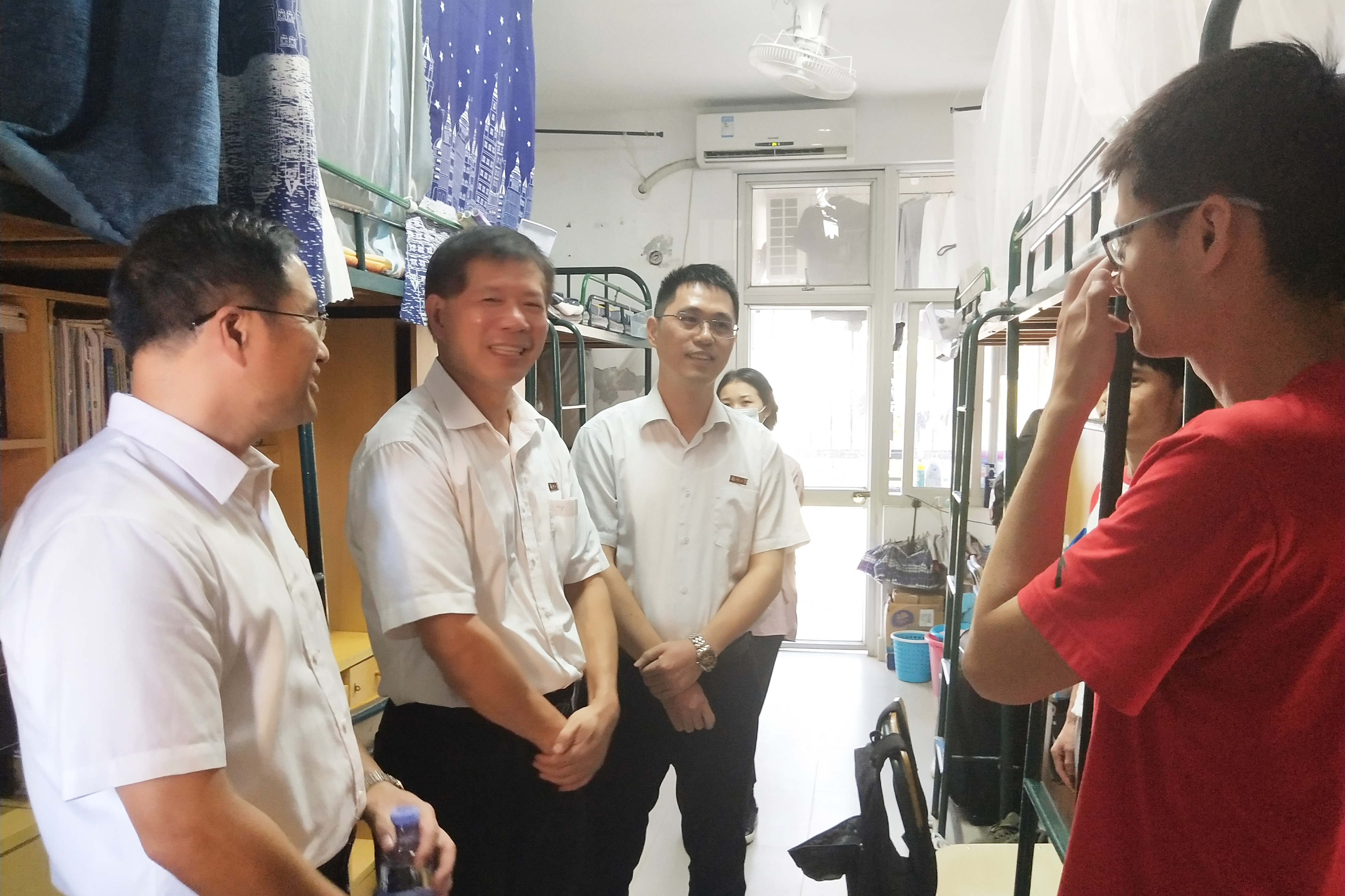 10月4日下午,校党委张天明书记,林生副书记等学校领导莅临我院学生宿舍楼指导工作。期间,院党委郑寿副书记为前来视察工作的领导介绍我院近期开展的学生教育工作,以及近几年来我院学生参加研究生招生考试的相关情况。当提到学生平时的学习生活状况时,郑书记说道:“虽然我院学生在入学时的录取分数上不占优势,但我院学生入学后都非常努力,同样得到了很大的进步,取得了很多优秀的成绩。”在领导们视察宿舍内的生活环境时,张天明书记与同学们进行了亲切的交流,张天明书记询问了同学们平时的学习和生活情况,并提醒同学们:“要不断地努力学习、积极上进,学到更多的知识来充实自己,同时也要注意锻炼身体,多去观察外面的世界,注重个人整体素质水平的提高。”